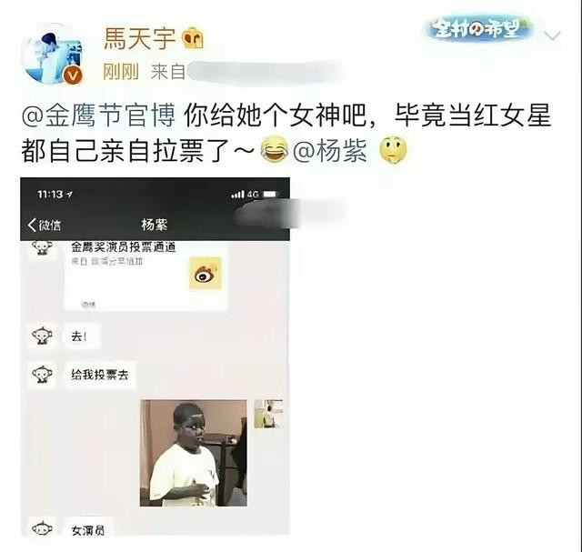 杨紫发动自己的圈内好友为自己全力投票,她当时把投票链接发给了同为好友的马天宇,马天宇在收到杨紫的消息后,便在社交平台把杨紫给挂了出来,还艾特金鹰奖的官博。